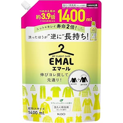 【大容量】エマール 伸びヨレ戻して元通り、洗ったほうが、逆に長持ち! リフレッシュグリーンの香り 詰替え用 1,400mlは、その名の通り、衣類の伸びやヨレを修復し、長持ちさせる効果が特徴的な洗濯用洗剤です。洗濯物の寿命を2倍に延ばすという主張は、特にお気に入りの服を長く大切に着たいと思う消費者にとっては、非常に魅力的なポイントと言えるでしょう。