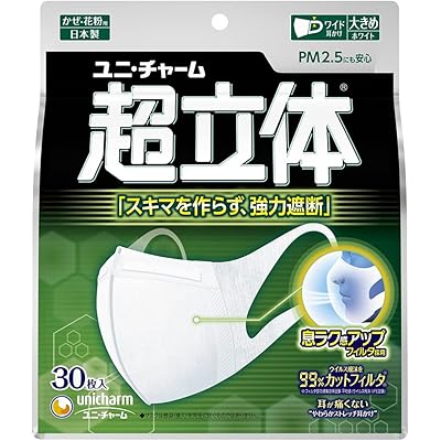 この商品は「超立体マスク 風邪・花粉用 不織布マスク 日本製 大きめサイズ 30枚入 ノーズフィットつき 〔PM2.5対応 日本製〕 (99% ウィルス飛沫カットフィルタ)」という名前で、その名前から察するに、風邪や花粉症対策に非常に有効なマスクであることが伺えます。また、PM2.5対応という表記からは大気汚染による微細粒子もブロック可能であることがわかります。これは現代社会においては大変重要な機能であり、健康を守るためには必須の機能とも言えます。