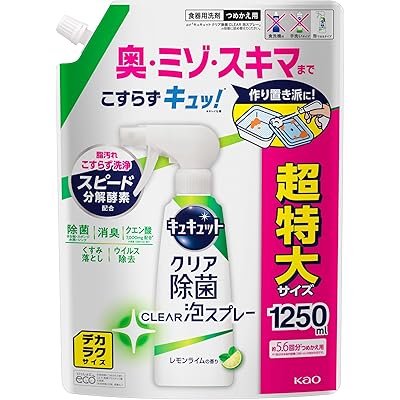 キュキュット 【大容量】デカラクサイズ クリア除菌CLEAR泡スプレー 食器用洗剤 奥・ミゾ・スキマまでこすらず洗浄! レモンライムの香り つめかえ用1250m …