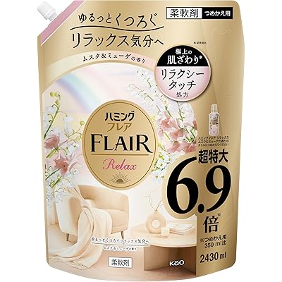 「ハミングフレア リラックスムスク&ミューゲ詰め替え大容量2430ml」の商品説明を拝見し、まずそのボリュームに驚きました。詰め替え用で2430mlという大容量は、家族が多い方や頻繁に洗濯をする方にとって、とてもコストパフォーマンスが高いと感じます。また、ゴミの削減やストックの手間を減らせる点も便利そうです。