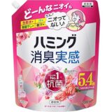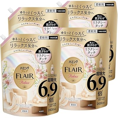 「ハミングフレア リラックスムスク&ミューゲの香りつめかえ大容量2430ml×4個【ケース販売】」は、衣類や寝具用の柔軟剤として、リラックス効果を意識した商品だと感じました。香りはやさしい甘さのムスクと爽やかなミューゲ(すずらん)の組み合わせということで、香水のように重すぎず、軽やかで心地よい印象が想像できます。寝る前のリラックスタイムや、パジャマ、寝具などに使うと、一日の疲れを癒してくれそうです。