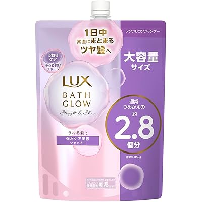 LUX(ラックス)の「バスグロウ ストレートアンドシャイン シャンプー」つめかえ用は、髪のうるおいやツヤ感を重視する方にぴったりな商品という印象を受けました。商品の説明からも分かる通り、「朝起きてから1日中素直にまとまるツヤ髪」をコンセプトにしており、髪内部への保水ケアに特化している点が特徴的です。「ぷるぷる浸透ウォーターゼリー」配合という、他にはない独自成分が魅力的ですし、スイゼンジノリエキスやアルギニンなど、保湿成分がしっかり含まれていることも分かります。うねりを抑えたい方や、髪のまとまりが気になる方には特に嬉しい処方だと感じました。