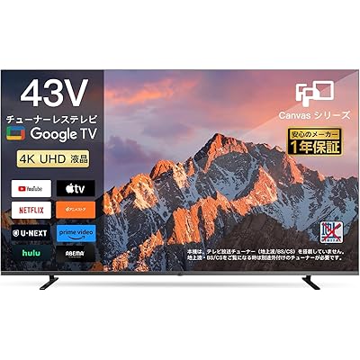 FPD チューナーレステレビ 43V型 4K Google TVは、現代のテレビ視聴スタイルにしっかりと対応したスマートテレビという印象を受けました。最大の特徴は地上波やBS、CS放送のチューナーをあえて搭載しないことで、ネット動画やストリーミングサービスに特化した設計がなされている点です。NetflixやPrime Video、YouTubeといった主要な動画配信サービスがプリインストールされているのはもちろん、Google Playからさまざまなアプリを追加できるので、映画や音楽、ゲームなど幅広いコンテンツを手軽に楽しめるのが魅力です。