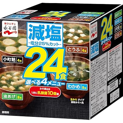 この商品は、永谷園の「箱入り生みそタイプ徳用24食みそ汁」の減塩タイプで、4種類のメニュー(わかめ・油あげ・小町麩・とうふ)がアソートされています。これらのメニューは、日本人の食卓に欠かせない定番の具材で、バラエティー感があるのが特徴です。また、生みそタイプということで、自宅で簡単に本格的な味噌汁を楽しむことができるのが魅力的です。