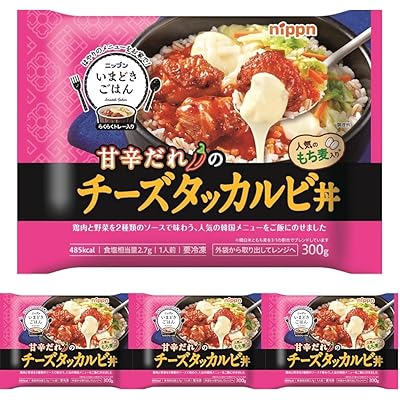 「[冷凍] ニップン いまどきごはん チーズタッカルビ丼 300g (× 4)」の商品説明を拝見し、現代の冷凍食品らしい工夫とバランスに好感を抱きました。まず注目したいのは、国産の精白米とグリルチキン、もち麦加工品を使っている点です。もち麦は最近注目されている食材で、白米との組み合わせで食感や栄養面でも充実していそうです。チキンもグリルしてあるため、香ばしさや旨みが感じられる仕上がりが期待できます。