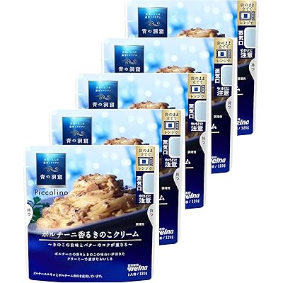 「青の洞窟 Piccolino ポルチーニ香る きのこクリーム」は、きのこの旨味とバターのコクが重なる贅沢なソースという印象を受けました。商品説明から、特にポルチーニの香りと、複数種類のきのこ(エリンギ、マッシュルーム、しいたけ)の旨味がしっかりと感じられることが伝わってきます。また、バターや生クリーム、チーズといった乳製品が豊富に使われているため、濃厚でクリーミーな味わいが期待できる点も魅力的です。