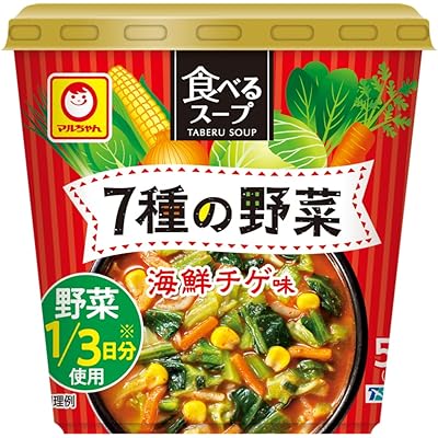 「マルちゃん 食べるスープ 7種の野菜 海鮮チゲ味 15g×6個」の商品説明を拝見し、まず最初に感じたのは、手軽に多種類の野菜が摂取できる点がとても魅力的だということです。キャベツ、たまねぎ、ねぎ、にんじん、小松菜、チンゲン菜、コーンと、普段の食事ではなかなか揃えるのが大変な野菜が7種も入っているので、栄養バランスを気にする方や野菜不足が気になる方にはぴったりだと思いました。しかも、1/3日分の野菜が摂れるというのは、忙しい現代人には大きなメリットですね。