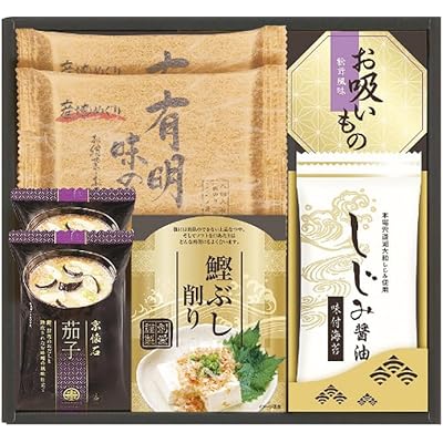「白子のり&マルコメ和風詰合せ SW-25」は、日本の伝統的な食文化を気軽に楽しめるギフトセットだという印象を受けました。内容を見ると、有明海産の味付のりを中心に、マルコメの京懐石茄子のおみそ汁、永谷園のお吸いもの松茸風味、さらには鰹節削りもセットになっていて、和風の朝食や軽食が手軽に作れるラインナップです。