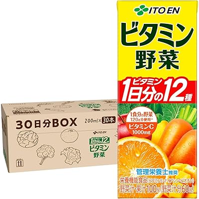 伊藤園の【Amazon.co.jp限定】ビタミン野菜30日分BOXは、忙しい現代人や野菜不足が気になる方にとってとても便利な商品だと感じました。1本200mlの紙パックが30本入っており、1日1本飲むことで1ヶ月分のビタミンと野菜が効率よく摂取できるのが魅力的です。特に、12種類のビタミンを1日分しっかり補えるだけでなく、ビタミンCが1本で1,000mgも含まれている点は、健康志向の方にとって嬉しいポイントだと思います。