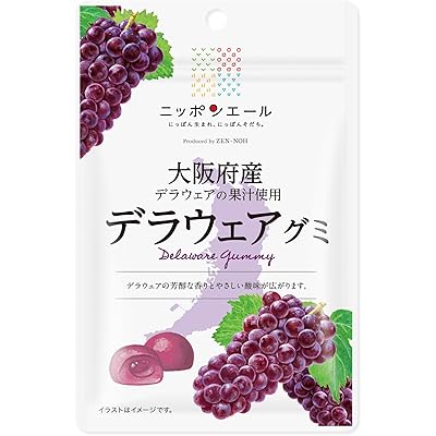 全国農協食品の「大阪府産デラウェアグミ 40g×10袋」は、国産の原料にこだわったグミという印象を受けました。特に、大阪府産のデラウェア果汁を使用しているところが魅力的です。デラウェアは小粒で甘みが強いぶどう品種として知られており、その芳醇な香りとやさしい酸味がグミで再現されているとのことで、フルーティーでみずみずしい味わいが期待できそうです。