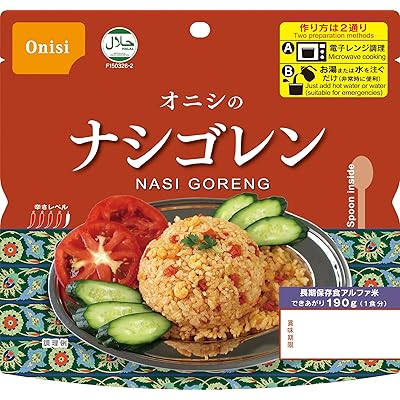 ナシゴレンはインドネシアやマレーシアの伝統的な辛味の効いたチャーハンということで、普段食べ慣れていない味を非常時でも楽しめるのは嬉しいポイントです。原材料を見てみると、国産うるち米がベースになっており、味付乾燥具材や調味粉末にはエビや玉ねぎ、人参、赤唐辛子、ガーリックパウダーなどが使われており、しっかりとした風味や旨みが期待できます。加えて、電子レンジ調理にも対応しているため、手軽さと美味しさの両立が図られています。
