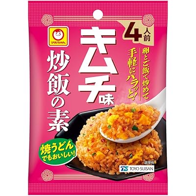 「キムチ味 炒飯の素 3人前 x12個」は、東洋水産が手掛けるユニークな炒飯の素で、キムチ風味と鶏・魚介の旨みを特徴としています。原材料を見てまず目を引くのは、魚醤や味噌、醤油など和と韓国のエッセンスがバランスよく配合されている点です。キムチのピリッとした辛味や発酵由来のコクが、ご飯や卵と合わさることで、食欲をそそる味わいになりそうです。また、魚介エキスパウダーやチキンエキスパウダーが使われているため、コクや旨みがしっかり感じられそうなのも嬉しいポイントです。