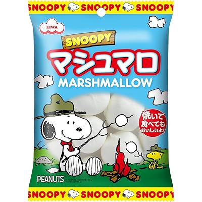 「エイワ スヌーピービッグマシュマロ 65g×12入」は、その名の通り大きめサイズのマシュマロがたっぷりと楽しめる商品です。まず目を引くのは、スヌーピーとウッドストックが焚き火を囲んでいる可愛らしいパッケージデザインです。このパッケージを見るだけで、子どもから大人までワクワクする気持ちになりそうです。特にスヌーピー好きにはたまらないビジュアルで、ギフトやパーティー用にも重宝しそうだと感じました。