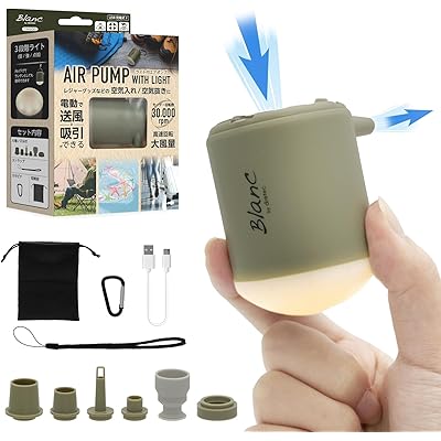 さらに6種類ものノズルが付属していることで、様々な用途や空気注入口の形状に対応できる柔軟性も魅力的だと思います。加えて、3段階切り替えが可能なライト機能が備わっていて、ランタンや災害時の非常灯としても使えるのは非常に便利です。アウトドアだけでなく、いざというときの防災グッズとしても重宝しそうです。